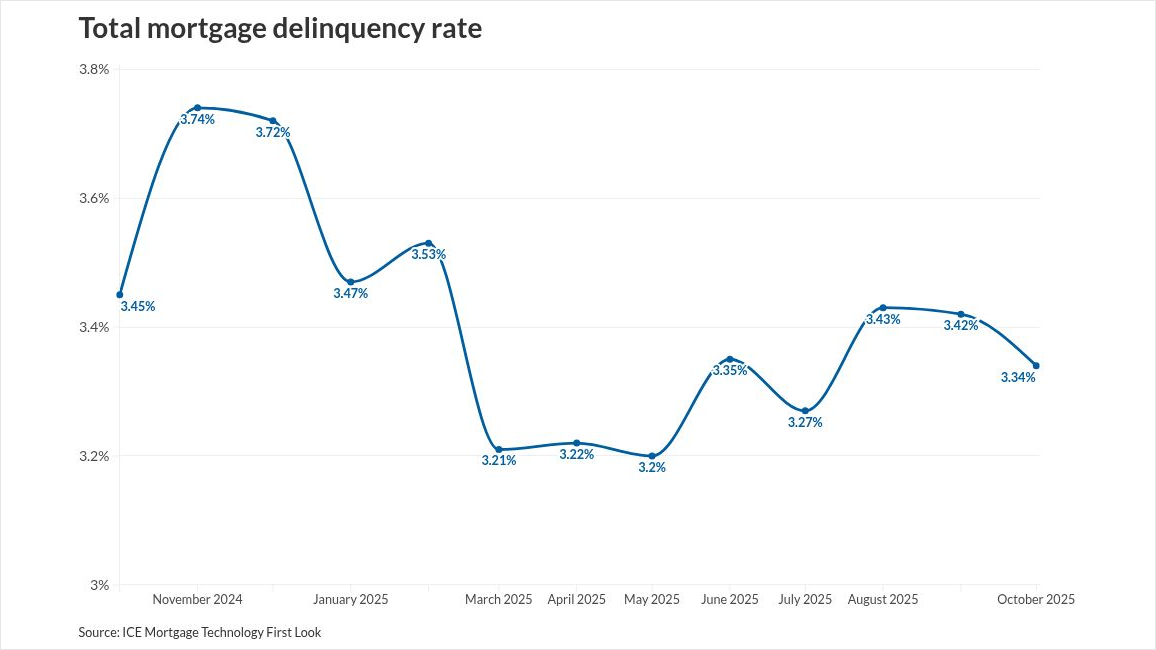The total delinquency rate, defined as any loan 30 days or more late on its payment but not yet in foreclosure, was 3.34% for October.